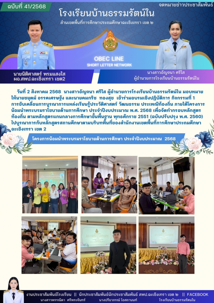 วันที่ 2 สิงหาคม 2568 นางสาวอัญจนา ศรีใส ผู้อำนวยการโรงเรียนบ้านธรรมรัตน์ใน มอบหมายให้ นายชยุตม์ อรรคเศรษฐัง และนายคมกริช ทองสุข เข้าร่วมอบรมเชิงปฏิบัติการ กิจกรรมที่ 1 การขับเคลื่อนการบูรณาการแหล่งเรียนรู้ประวัติศาสตร์ วัฒนธรรม ประเพณีท้องถิ่น ภายใต้โครงการน้อมนำพระบรมราโชบายด้านการศึกษา ประจำปีงบประมาณ พ.ศ. 2568 เพื่อจัดทำกรอบหลักสูตรท้องถิ่น ตามหลักสูตรแกนกลางการศึกษาขั้นพื้นฐาน พุทธศักราช 2551 (ฉบับปรับปรุง พ.ศ. 2560) ไปบูรณาการกับหลักสูตรสถานศึกษาตามบริบทพื้นที่ของสำนักงานเขตพื้นที่การศึกษาประถมศึกษาฉะเชิงเทรา เขต 2